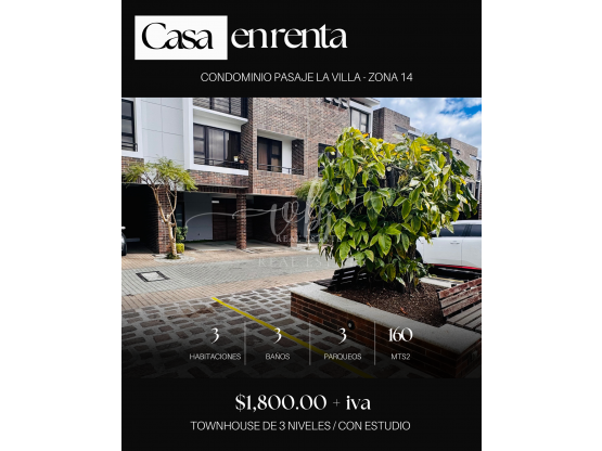 Lindo townhouse en alquiler en Condominio Pasaje La Villa, zona 14, con tan solo 17 casas con acceso directo. Es un condominio exclusivo, con parqueos de visitas y área de juegos de niños.